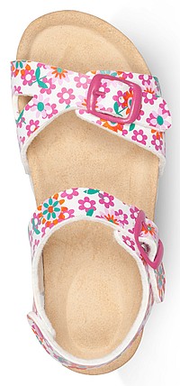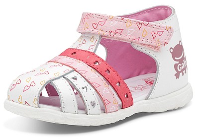 Baby Fashion – קבוצה חדשה ספורטיבית לבנות עם סוליה לבנה וגמישה ורפידה אנטומית מצופה למניעת הזעה ושמירה על כף הרגל בשילוב גפות סנדלים אופנתיות בכסף לבן פרחוני וורוד.