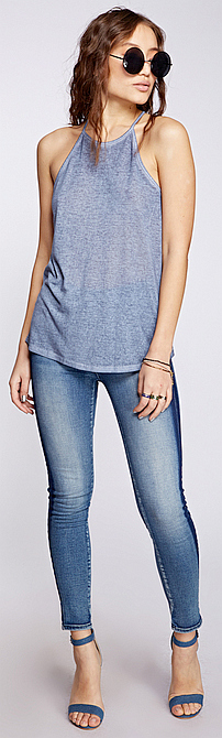 5) גזרות בייסיק – מחמיאות לגוף עם מחשוף V עמוק, מפתחי שינה, סירה וביצה. שילובי בדים שונים באותו הדגם יחד עם שטיפות שונות, גימורים גזורים, צריבות ודפוסים עם מוטיבים של כנפיים, גיטרה, דגלי מרוצי מכוניות.