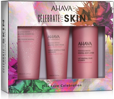 Pink Love Celebration (3 – הברכה: Celebrate your skin and plenty of love מצורפת למארז ובו שלושת מוצרי הדגל מסדרת Dead Sea Water בניחוח מתוק וחושני של קקטוס ופלפל ורוד. במארז החגיגי תחליב גוף 250 מ"ל, קרם ידיים 100 מ"ל וג'ל הרחצה החדש בסדרה 200 מ"ל. המחיר: 129 שקל.