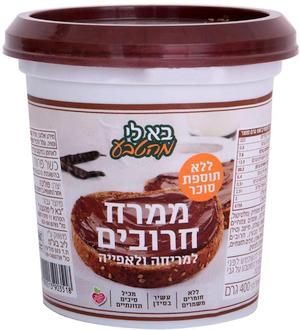 ממרח החרובים הזה מבוסס על פרי החרוב ומכיל לפחות 15% פרי, עשיר בסידן ומכיל סיבים תזונתיים. ללא תוספת סוכר, ללא חומרים משמרים, ללא שמן דקל וללא חומרים מהחי, מתאים לטבעונים. ממרח החרובים מהווה מקור לסידן, המסייע בבניית העצמות, וכן מקור לסיבים תזונתיים המסייעים בפעילות מערכת העיכול.