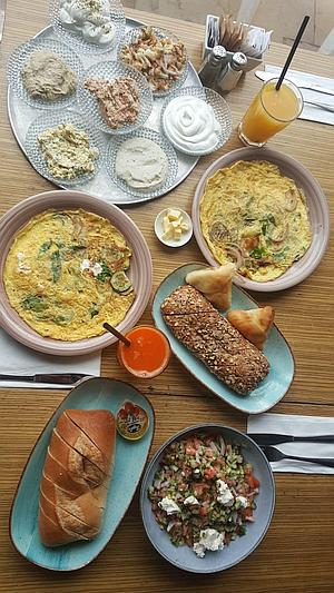 ארוחת בוקר בסגנון יווני – כוללת חביתת תרד, זוקיני וגבינת פטה. מוגשת עם מבחר מאזטים: כרובית, סלט טונה, גבינת שמנת, לאבנה וזעתר, סלט חציל, חומוס ופלאפל וסלט טבולה. כמו כן, בארוחה זו גם סלט קצוץ אישי עם גבינת פטה מעל וסלסלת לחמים מגוונת. המחיר: 69 שקל.