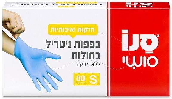 עוד פריט חדש מ"סנו סושי", שמאושר על ידי בד״ץ העדה החרדית ירושלים ולשימוש בפסח הוא מארז עם כפפות ניטריל כחולות, ללא אבקה. הן עשויות מחומר עבה במיוחד וגמיש במיוחד, שמעניק להן עמידות מתמשכת ונוחות לביצוע מגוון עבודות בבית ובסביבתו. מוצעות בשלוש מידות : S ,M, L . בכל אריזה 80 יחידות ומחירה: 24.90 שקל – 29.90 שקל.
