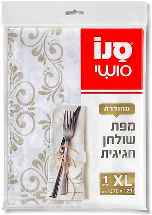 חגיגית, מעוצבת וגמישה, מבד לא ארוג וגדולה במיוחד – מציע לנו המותג "סנו סושי". המפה מאושרת לשימוש בפסח ועל-ידי בד״ץ העדה החרדית ירושלים ומאוד מתאימה לכל ימות השנה כי מידותיה הגדולות מאפשרות אירוח בשולחן גדול במיוחד. בכל אריזה מפה אחת בגודל: 270 ס״מ על 120 ס״מ. היא מוצעת בשני הדפסים מהודרים: בזהב או בכסף, כך שנוח להתאימה לסט הסכו״ם ולעיצוב שולחן האוכל. המחיר: 4.90 שקל – 8.90 שקל.
