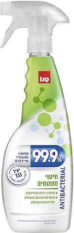 מתז לחיטוי משטחים 99.9% – נוזל לחיטוי מהיר המתאים גם למשטחים עדינים. באריזה 750 מ"ל ומחירה: 14.90 שקל – 18.90 שקל.