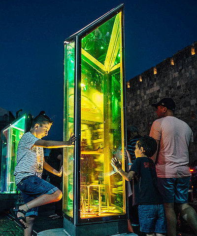 היכן מתקיים: הפסטיבל מתפרס לאורך שלושה מסלולים ברחבי העיר העתיקה, המסומנים במפה שמקבלים במקום בצבעים: אדום, כחול, ירוק. הליכה לאורך המסלולים מובילה את המבקרים לעולם שבו האור בורא יצירה חדשה בכל ערב מחדש, עם למעלה מ- 30 מיצגי אור אינטראקטיביים ויצירות אומנות מוארות. מסיבה רב-חושית מהפנטת של אומני ה- VJ המובילים בעולם הממזגת צלילים ואורות על גבי חומות העיר העתיקה והקהל יוכל להשתתף ולרקוד לצלילי ה- VJ.