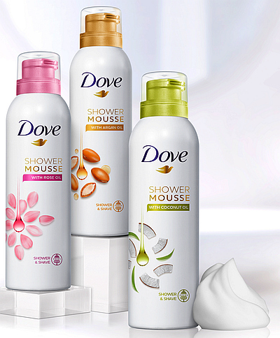 של "Dove" הוא מוס רחצה בתוספת שמנים חיוניים – שמתאים גם למקלחת וגם לגילוח. למרקם המוס יש מטבעו יתרון בגלל הקלילות והעדינות שלו ולכך מצטרפת העובדה שהפורמולה עדינה ללא פראבנים, ללא סולפטים ומתאימה לעור רגיש ולעור יבש. בסדרה החדשה שלושה מוצרים: מוס עם שמן קוקוס – בניחוח הטרופי האהוב; מוס עם שמן ורדים – בניחוח פרחוני ונעים; מוס עם שמן ארגן מרוקאי – בניחוח קטיפתי ועשיר.