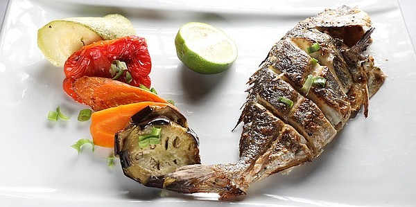 דג בתנור – דניס טרי (שלם) אפוי עם עשבי תיבול בליווי ירקות קלויים בתנור (המחיר: 120 שקל).