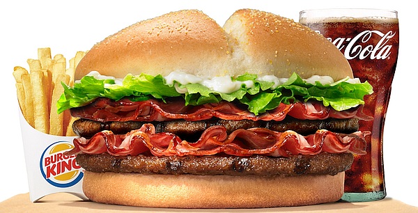2) דאבל בייקון קינג: כריך עם 2 קציצות מ-100% בשר בקר הנצלות על הגריל, עם אקסטרה בייקון הודו כשר. הכריך מגיע עם חסה ומיונז, בלחמניית תירס. המחיר: 40.90 שקל (מחיר ארוחה עם צ'יפס ושתייה בגודל רגיל: 56.90 שקל).