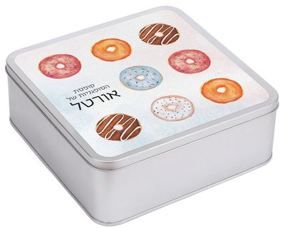 קופסת סופגניות: קופסת פח מעוצבת בגודל 21*21 ס"מ, המתאימה לאחסון סופגניות, לביבות, עוגיות ודברים טובים. המחיר: 47 שקל.