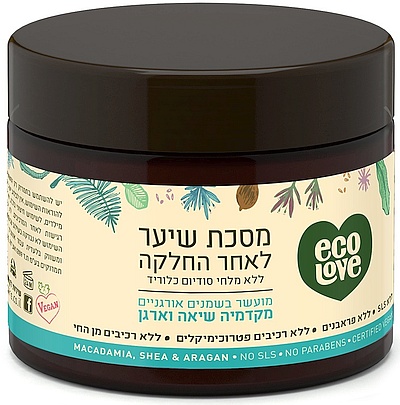 מסכה טבעית ללא מלחים, לטיפול אינטנסיבי ולשיער לאחר החלקה: המסכה מכילה שמן מקדמיה, חמאת שיאה, שמן ארגן מרוקאי, שמן קוקוס, שמן זית, שמן חוחובה, אלוורה, קלנדולה וקמומיל.