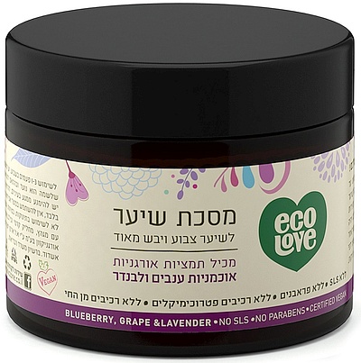 למרות כל מה שרשמתי, הפעם החלטתי ללכת כן על מסכה שמכוונת גם לשיער צבוע, שבינינו נוטה בברור להיות יבש, וזוהי "המסכה הסגולה" החדשה של "" EcoLove, שמכוונת להעניק לשיער ויטמינים ומינרלים חיוניים מפירות אורגניים. היא לא באמת סגולה, אלא בצבע לבן יפה ואילו הסגול שייך לאריזתה החיצונית, המעידה כי בין השאר היא מכילה תמציות מפירות סגולים: ענבים ואוכמניות