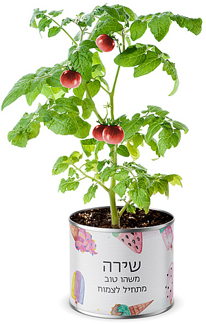 עציץ פורח במיכל פח בהשראת קופסת שימורים: מתאים למורים. יפה וגם טעים. זרעי בזיליקום או עגבניות שרי בעציץ מוכן, המכיל אדמה מדושנת. קופסת פח עגולה בקוטר 9 ס"מ ובגובה 8.5 ס"מ, עם תווית מעוצבת. כולל הוראות השקייה וטיפול. המחיר: 46 שקל.
