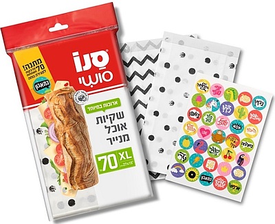 יש 70 שקיות, משני סוגים של הדפסים מעוצבים וטרנדיים ומצורפת מתנה: 70 מדבקות מעוצבות, צבעוניות ומשמחות לסגירה נוחה ולעיטוף חווייתי ומהנה. אפשר להחליט אם איזו מדבקה משמחים את הילד באותו הבוקר. עם כיתוב מעניין או איור.
