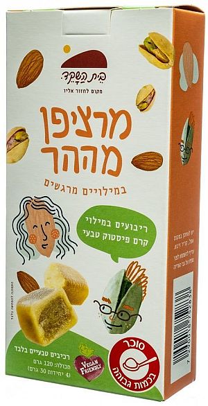 באריזה, שמשקלה 120 גרם, יש 4 יחידות של קוביות מרציפן נימוחות בפה, 30 גרם כל אחת. כדי לשמור על הטריות וההיגיינה, כל יחידה ארוזה בנפרד – בהמשך לקו של תשומת לב מלאה לממתק הטבעי הנהדר והמפנק הזה. המילוי מחומרים טבעיים, בלבד. יש 4 סוגים של אריזות: במילוי קרם פיסטוק, במילוי קרם שוקולד, במילוי קרם אגוזים ומרציפן נטו.