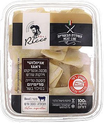 אניולוטי ראגו: טורטליני במילוי בשר בקר מכסה אנטריקוט וירקות שורש. הפסטה עשויה מחומרי הגלם הטובים ביותר, בעלת אחוז חלבון גבוה בקמח, אינה מכילה חומרים משמרים, צבעי מאכל או אבקות. מוכנה בקלות