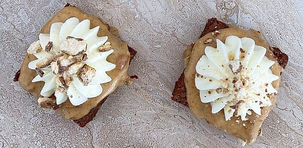 * מעל כל קוביית בראוניז, מניחים כפית של קרם בייגלה מלוח.