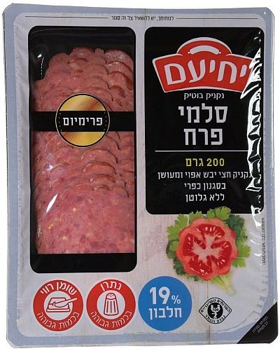 עם כל פירות הקיץ והמשקאות המרעננים, את תחושת העירנות האמיתית מעניקים לי פלחי הסלמי המפולפלים, פרוסים בצורת פרח של "מעדני יחיעם". על טוסט קלוי היטב ליד כוס הקפה של אחר הצהריים – ואני כמו חדשה. תוספת פלחי עגבניות וגם מלפפוני בייבי בקליפתם, ממתנים את הפילפול המוצלח ומשלימים את הצורך של מערכת העיכול בשעות האלו. נקניק הסלמי הוא חצי יבש, הוא אפוי והוא מעושן בסגנון כפרי בעץ בוק טבעי, המעניק לו טעם וארומה מיוחדים. מכיל תערובת בשרים מובחרת של הודו ובקר טחונים בטחינה גסה ומתובלים בתיבול עשיר וגרעיני פלפל שחור שלמים. נקניק הסלמי ללא גלוטן, מכיל 19% חלבון ומשווק באריזת פרמיום של 200 גרם.