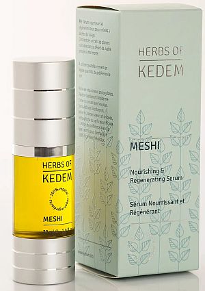 לאחר ניקוי הפנים והתזת "מי פנים "אביב", אני מניחה את סרום ההזנה לפנים "משי" (MESHI) בעל תכונות אנטי-אייג'ינג. הסרום הזה עשיר בתמציות מהצמחים חי-עד (ה"אימורטל" יקר הערך, מגידול אורגני בהרי חבל יתיר), לענה, ברוש, גרניום, אזוביון. תמציות הצמחים נתונות בתוך שמן חוחובה, שמן זית מהר הנגב, שמן קוקוס בתולי מכבישה קרה (מייבאים מהאי דבאו בדרום הפיליפינים בפיקוח חב”ד מנילה), שמן דקלים אדום (עשיר בויטמין( A , שמן סומסום, שמן אקליפטוס לימוני, שמן מקליפות אתרוג, עשב לימון, ויתניה משכרת (אשווגנדה), ילנג-ילנג, קינמון ומנטה. חייבת לשתף בעובדה שמרקם השמן מאוד מיטיב עם עור פני הבוגר. הוא מרגיש נעים, מעשיר, נספג היטב ולאחריו אני מניחה את קרם ההזנה שיפעל היטב בלילה על עור פנים שהוכן לכך.